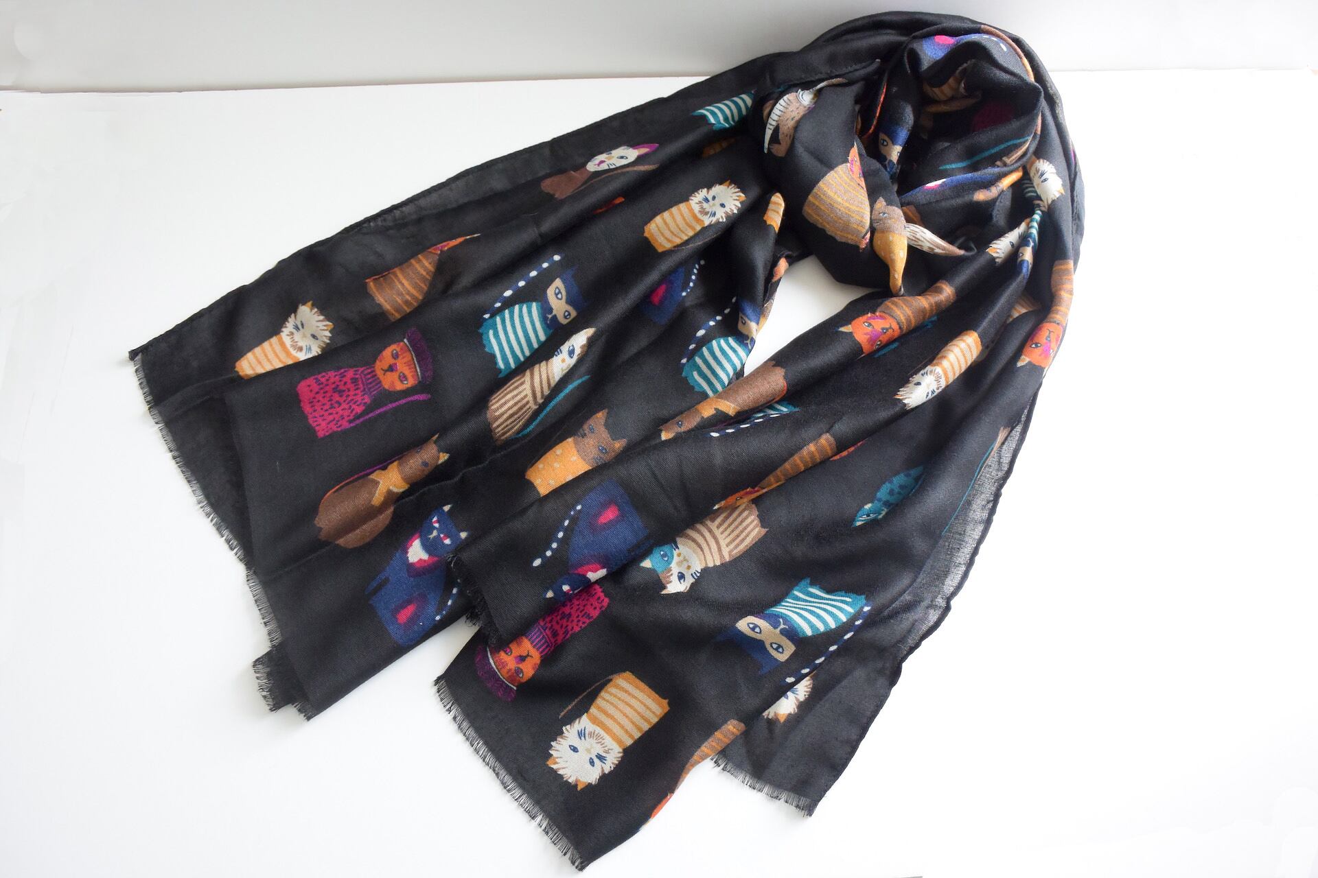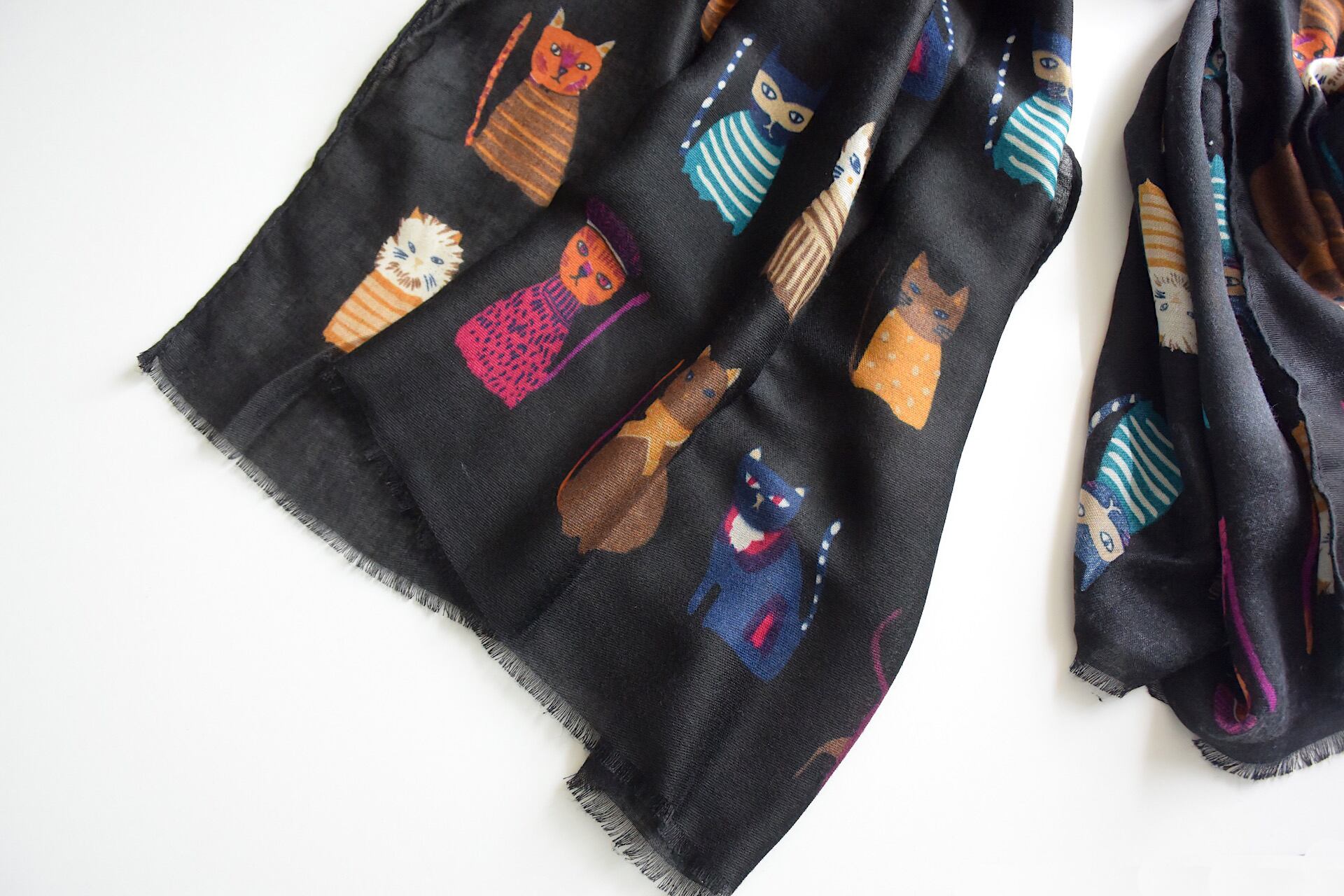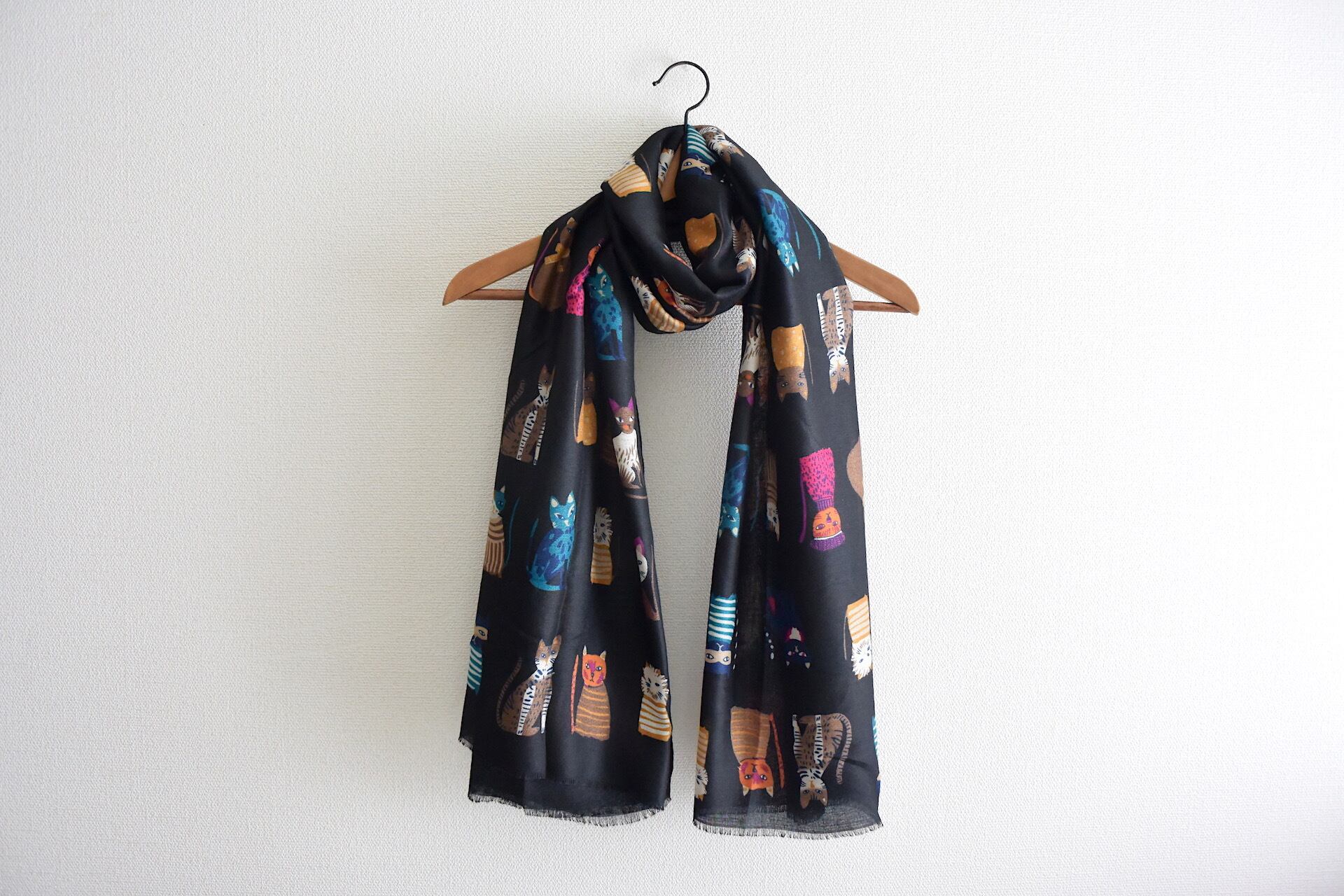 個性的な猫いっぱいのコットンレーヨンの大判ガーゼストール ブラック