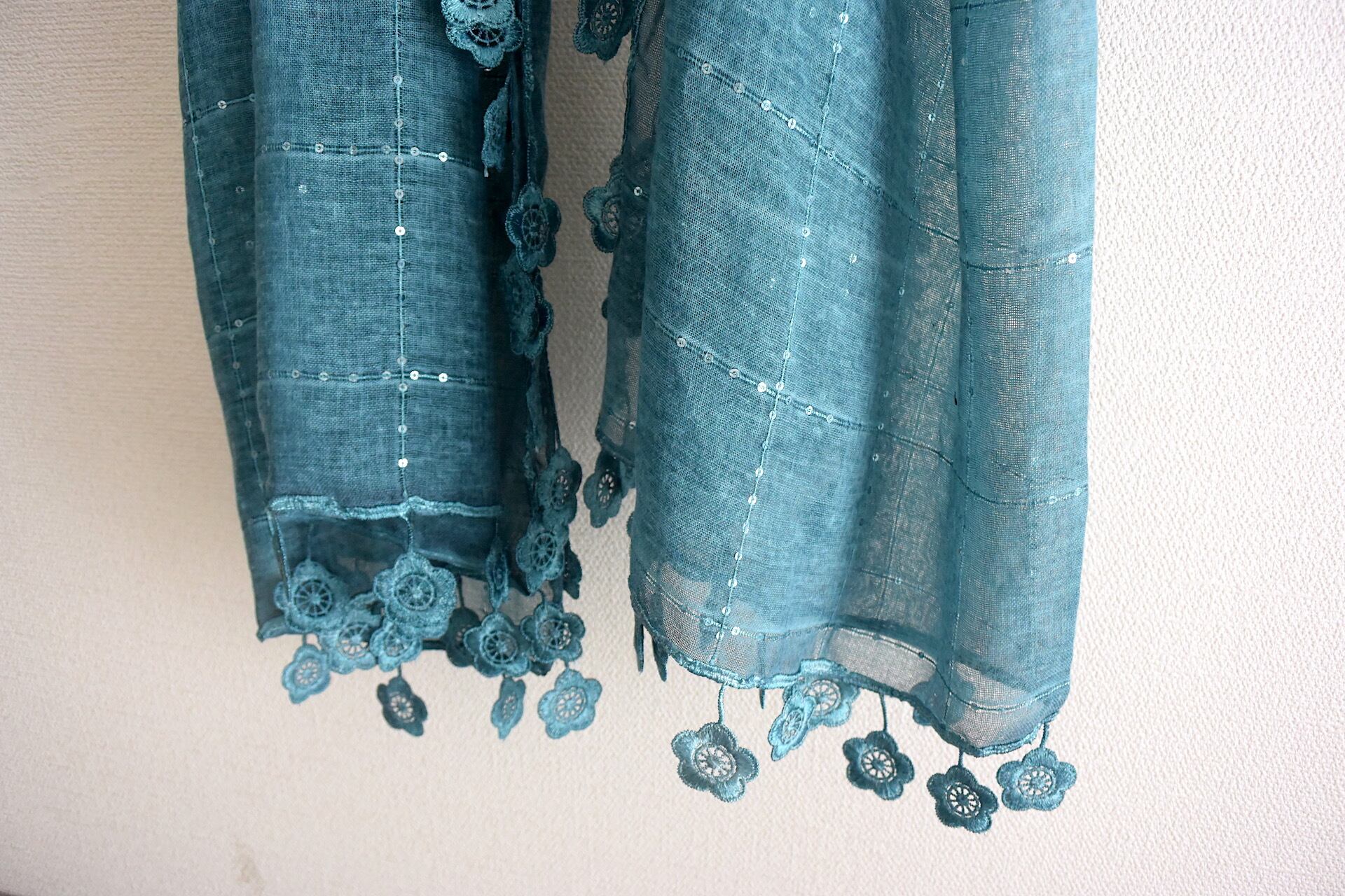 碁盤の目状に小さなスパンコールがあしらわれた繊細な生地に、周囲にぐるっとお花のタッセルを付けた華やかなストール。