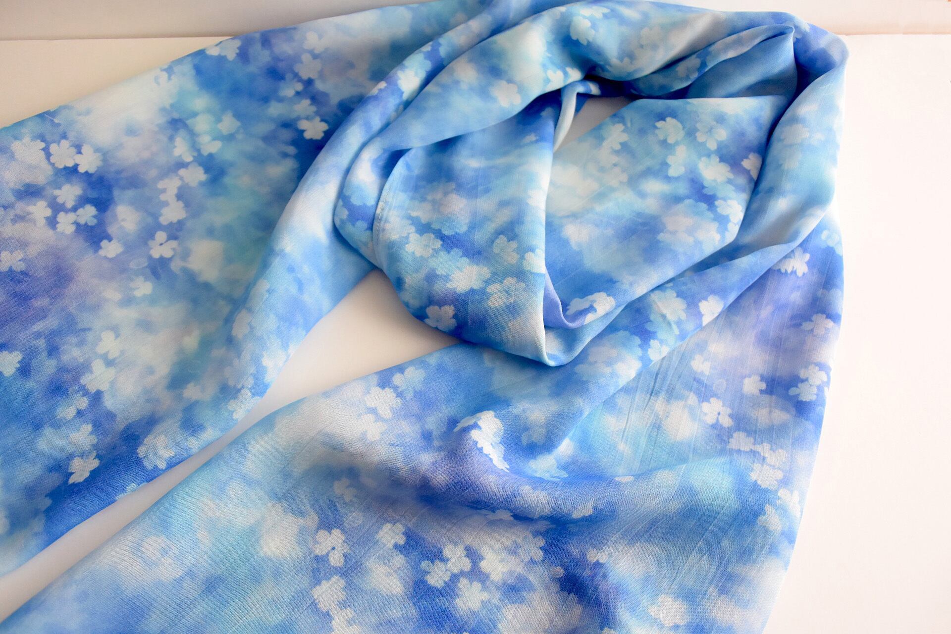 紫陽花のような澄んだブルーの花柄でお作りしたレーヨンシフォンのストール。
