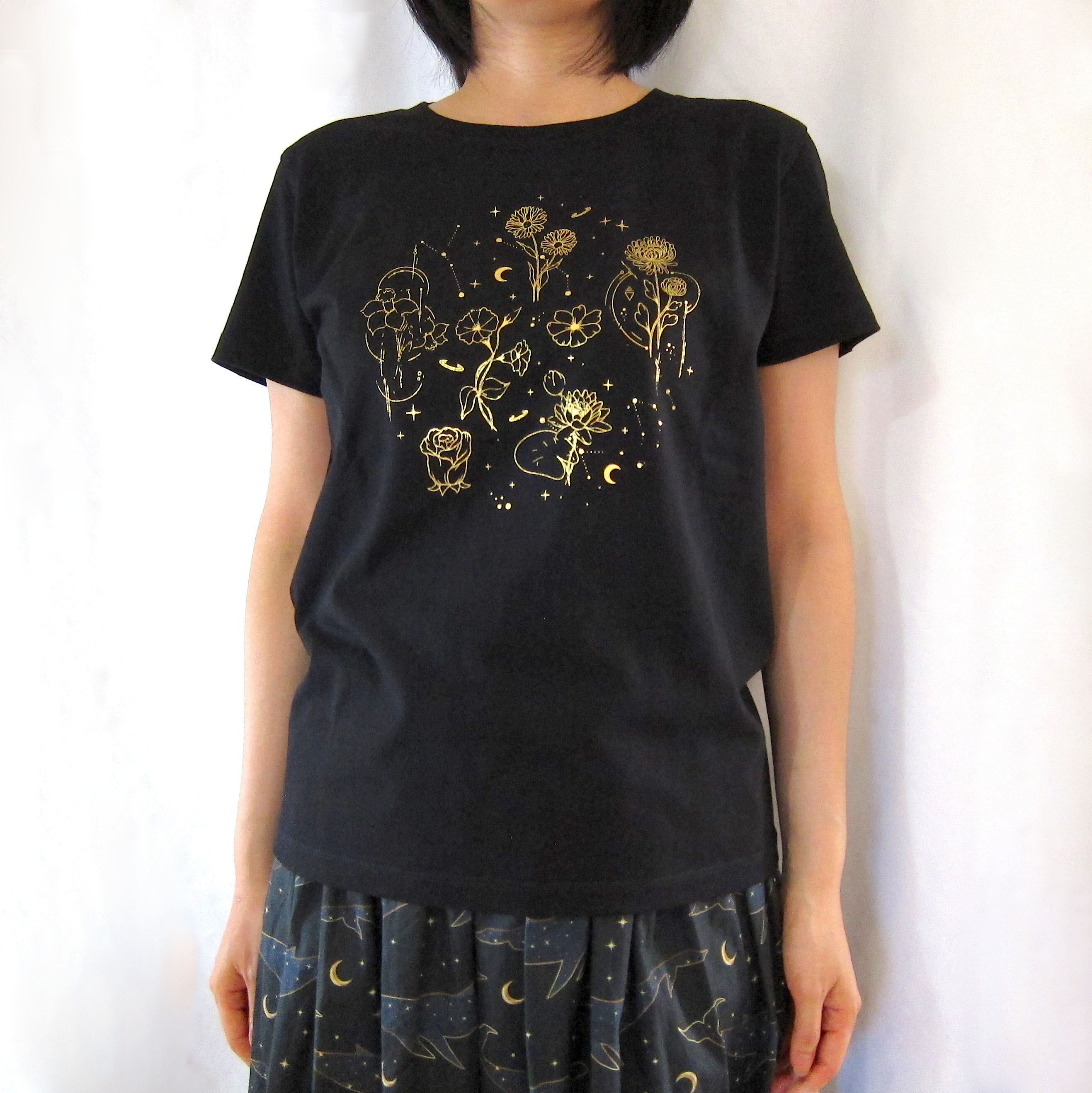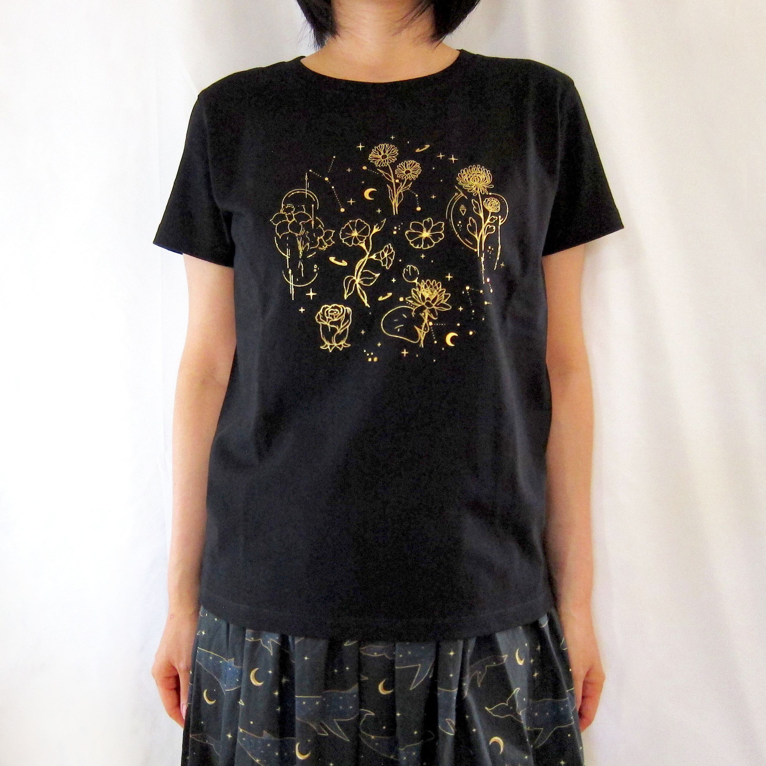 誕生花と夜空のモチーフを散りばめたTシャツ。