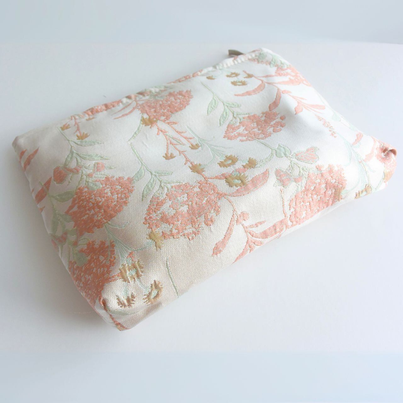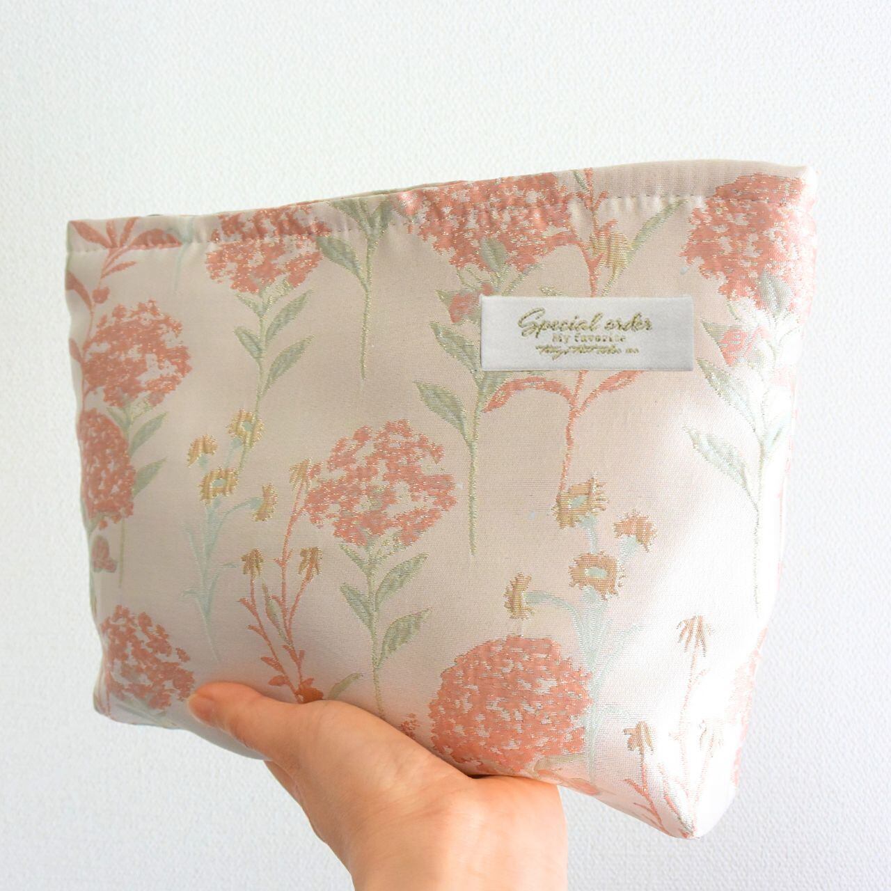 高級感のあるジャカード織で紫陽花が描かれた素敵なファブリックを生かした、大きめのポーチです。