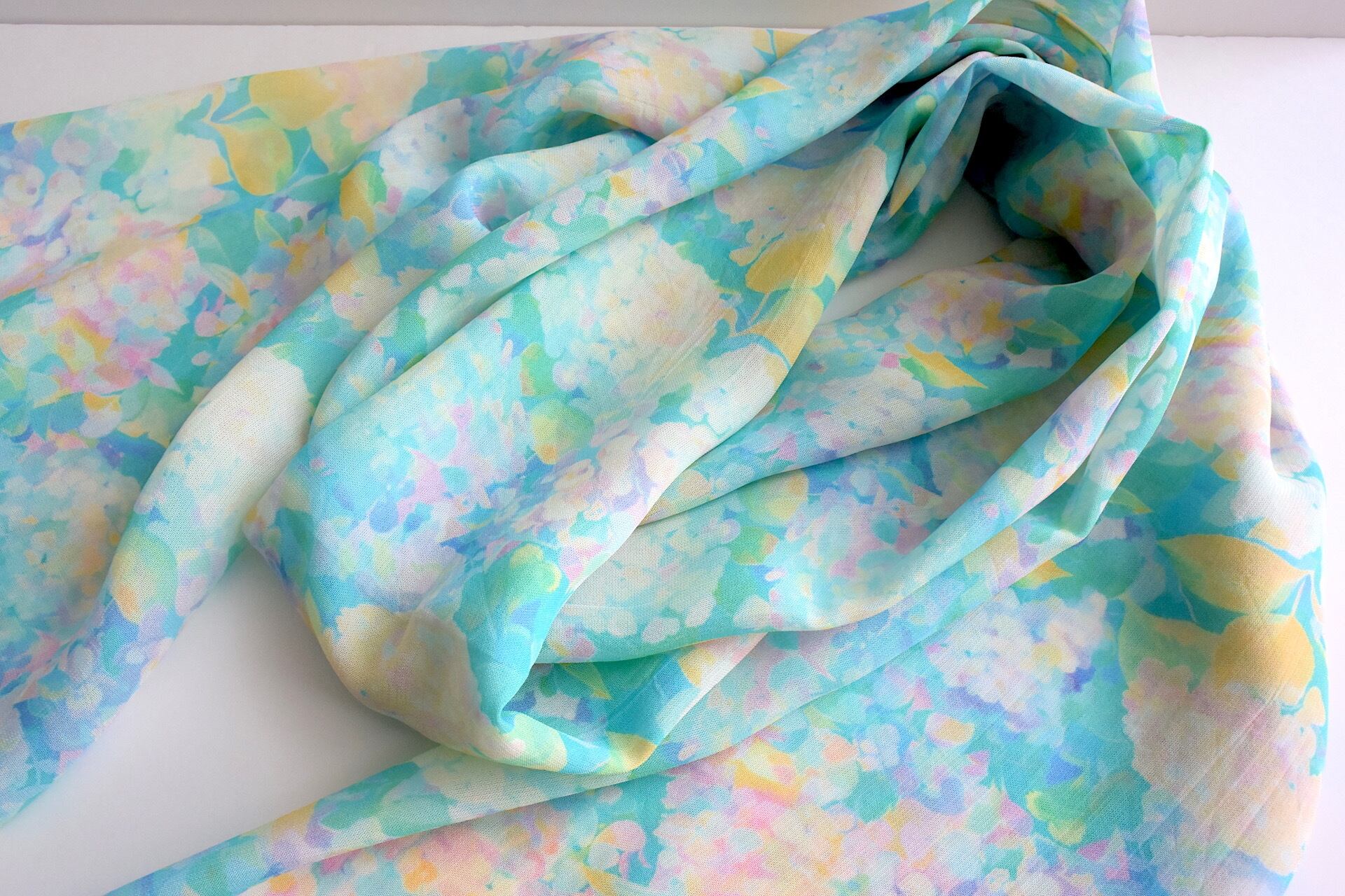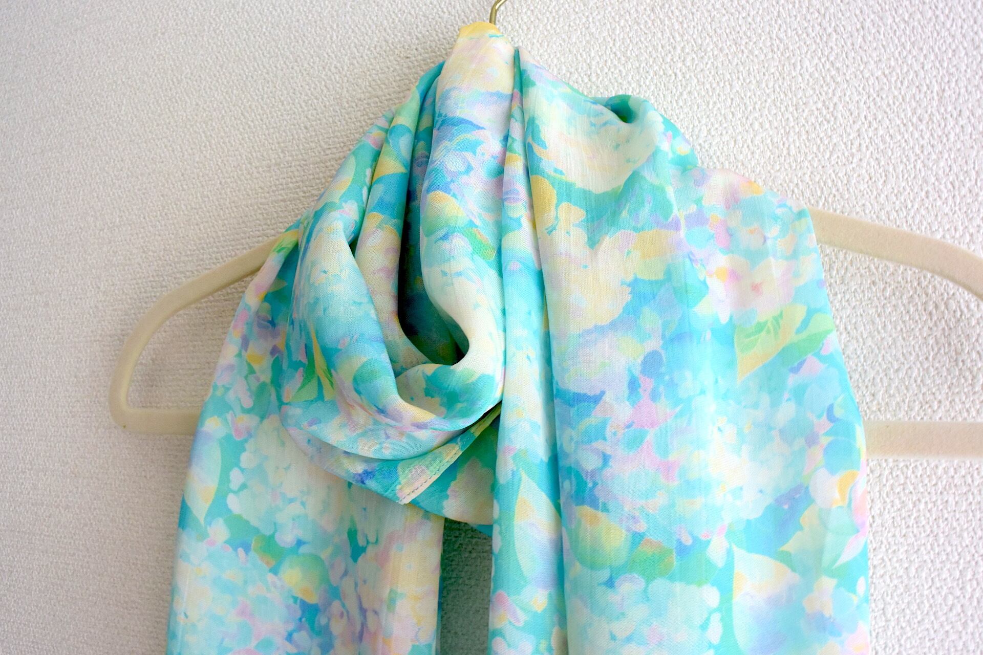 色とりどりの夢色カラーの紫陽花が咲き乱れる、レーヨンシフォンのストール。