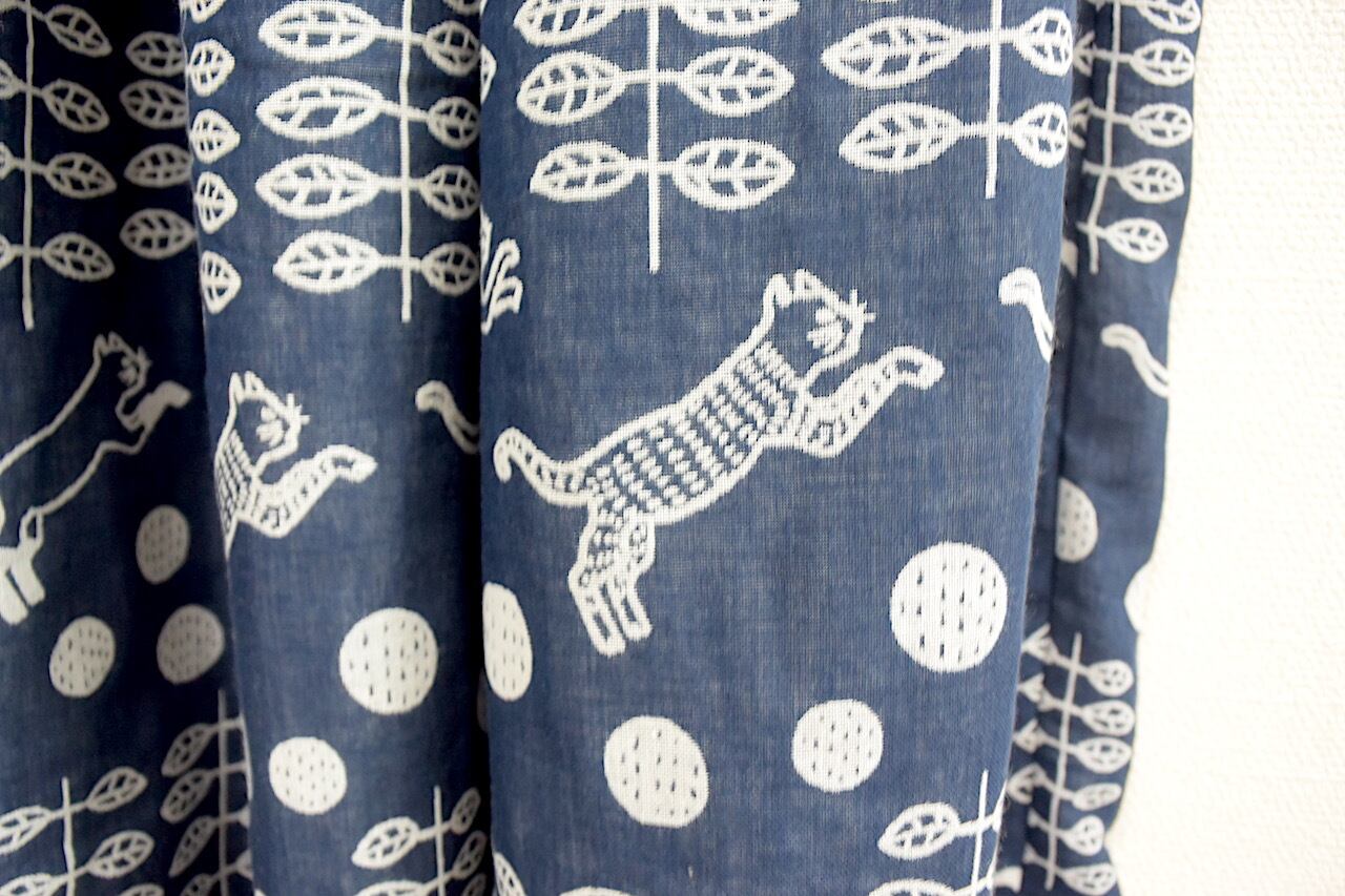 北欧テイストな猫・玉・草むらが横にずらっと並んだ、ジャカード織のダブルガーゼのスカートです。