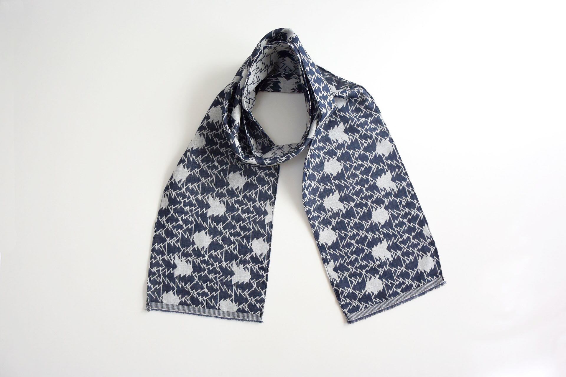 播州織の、木が線で森のように描かれた、幾何学模様のようなデザインのジャカード織のダブルガーゼで作ったミニストールです。