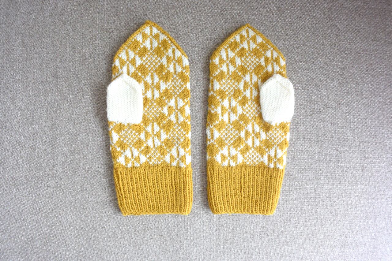 青森県津軽地方の伝統工芸である、こぎん刺しの定番模様「そろばん刺し」をミトンにしました。