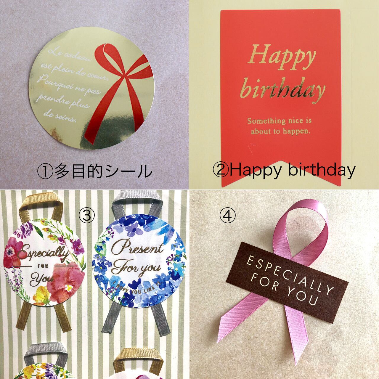 ②Happy birthdayシール … 赤地に金文字のシール(W37mm×H55mm)