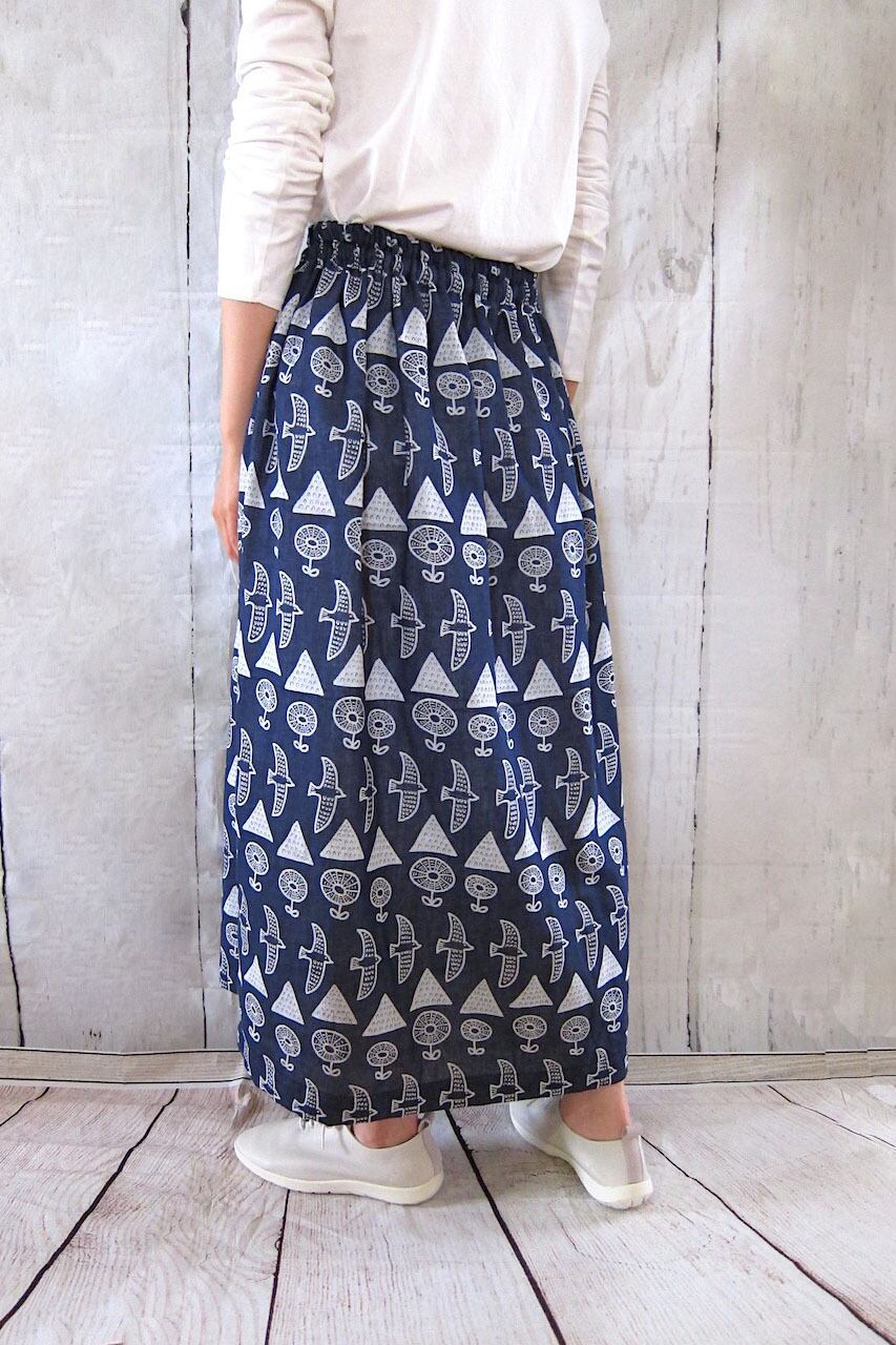 北欧テイストな鳥・花・森が横にずらっと並んだかわいい柄のダブルガーゼのスカートです。