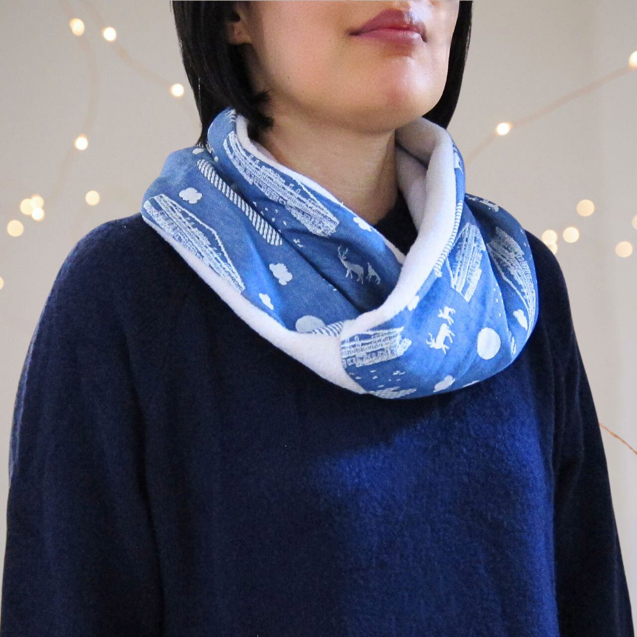 北欧テイストの、森の中に佇むコテージと鹿のパターンが丁寧に織り込まれたジャカード織生地に、フリース生地を合わせて作ったショートスヌードです。