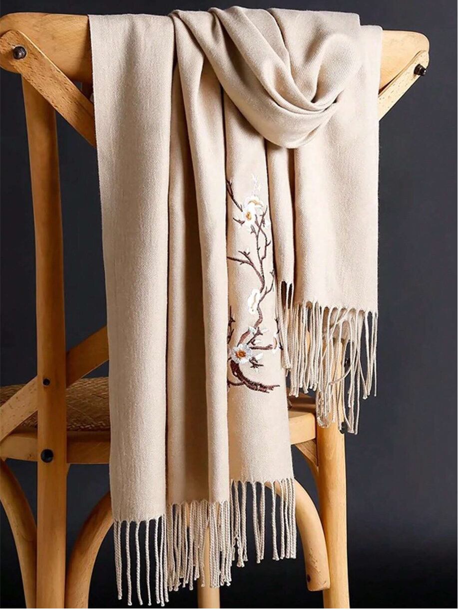 梅の刺繍入り大判ストール ベージュ