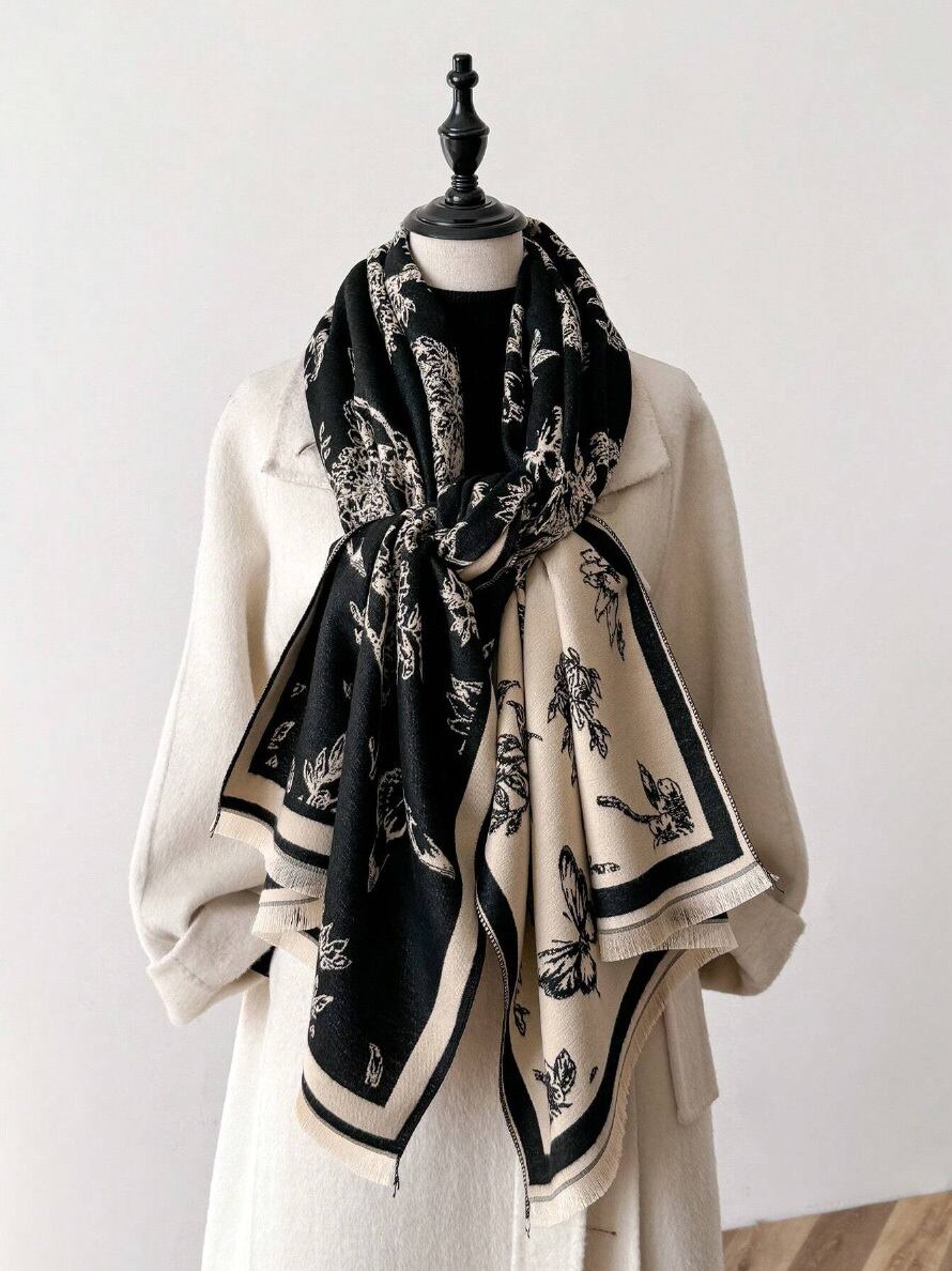 ボタニカル 花柄 蝶々 植物 大判 巻き物 冬 コーディネート 暖かい ポリエステル