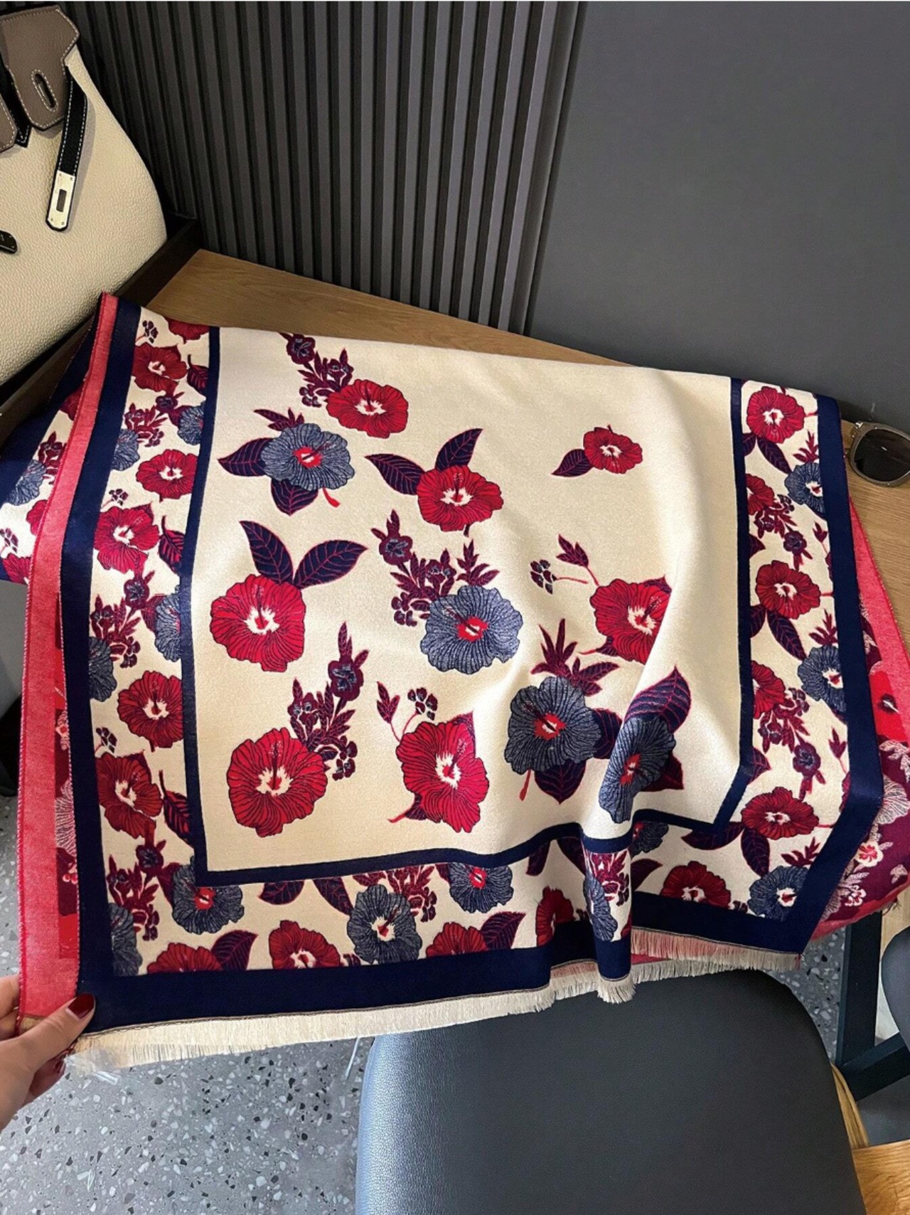 アイボリー地にオリエンタルな雰囲気の赤や青の花の縁取りが華やかで、さっと身に着けるだけで大人っぽく華やかな雰囲気になります。