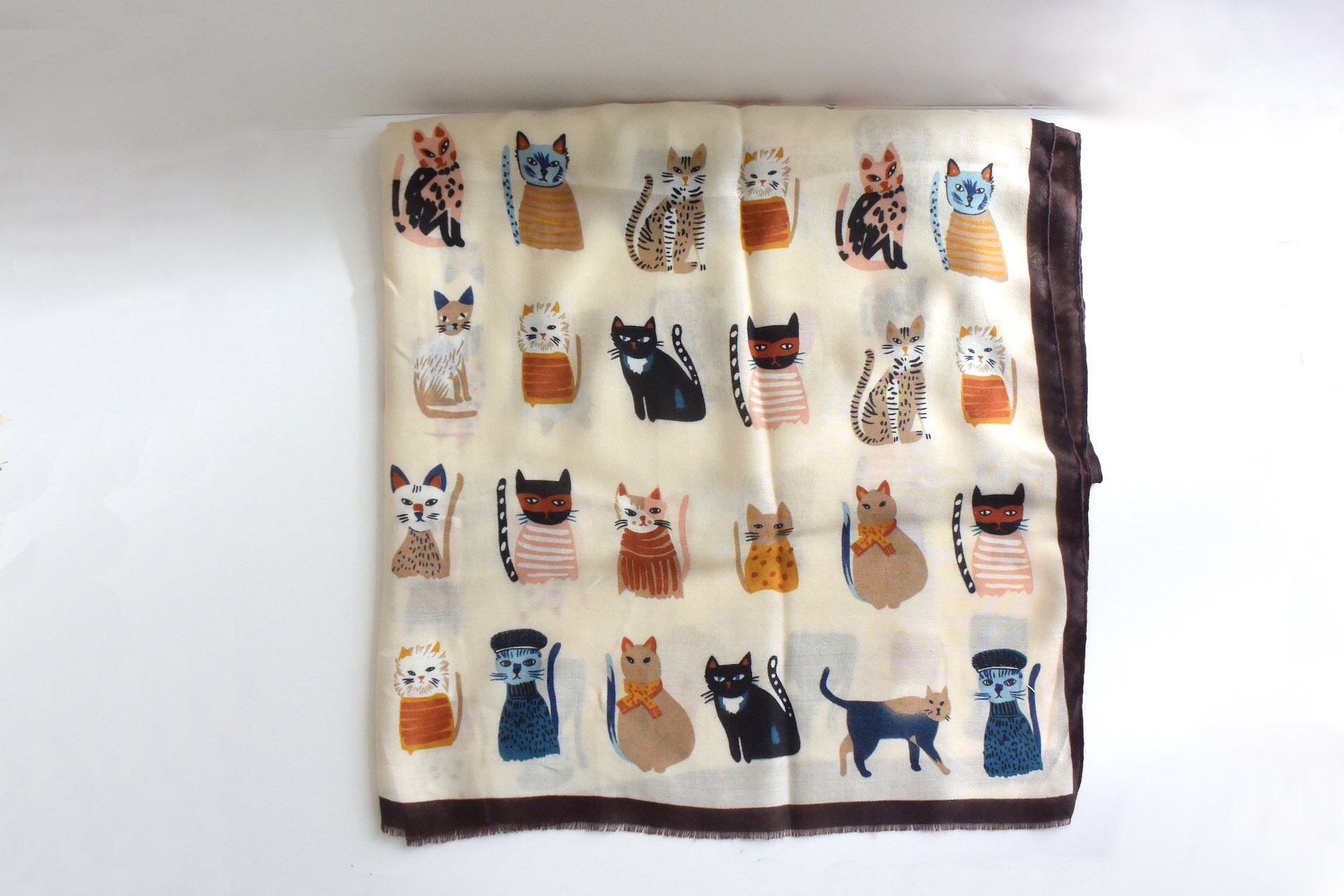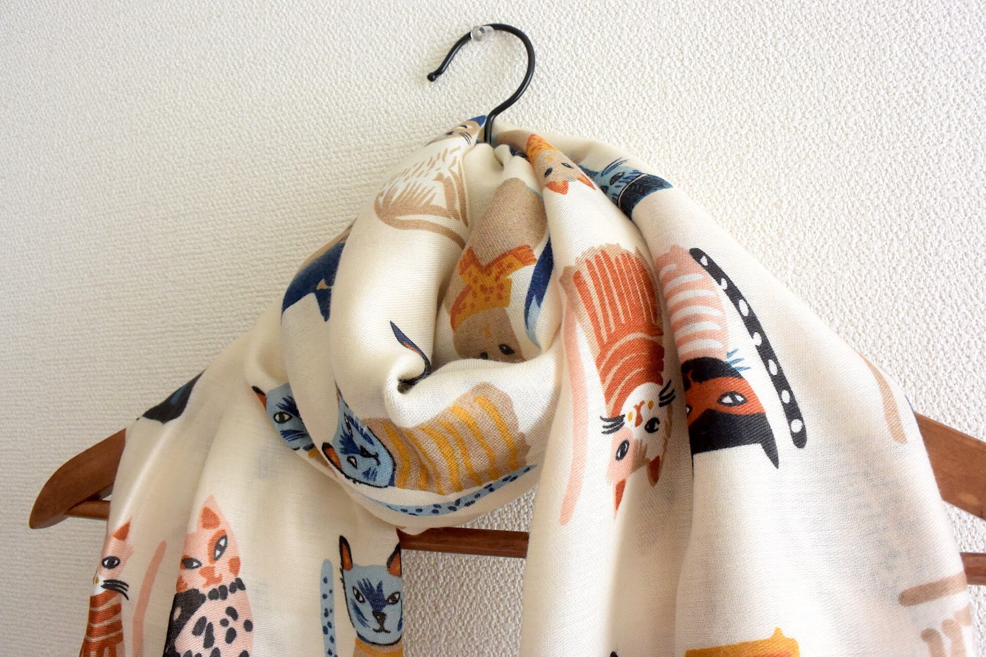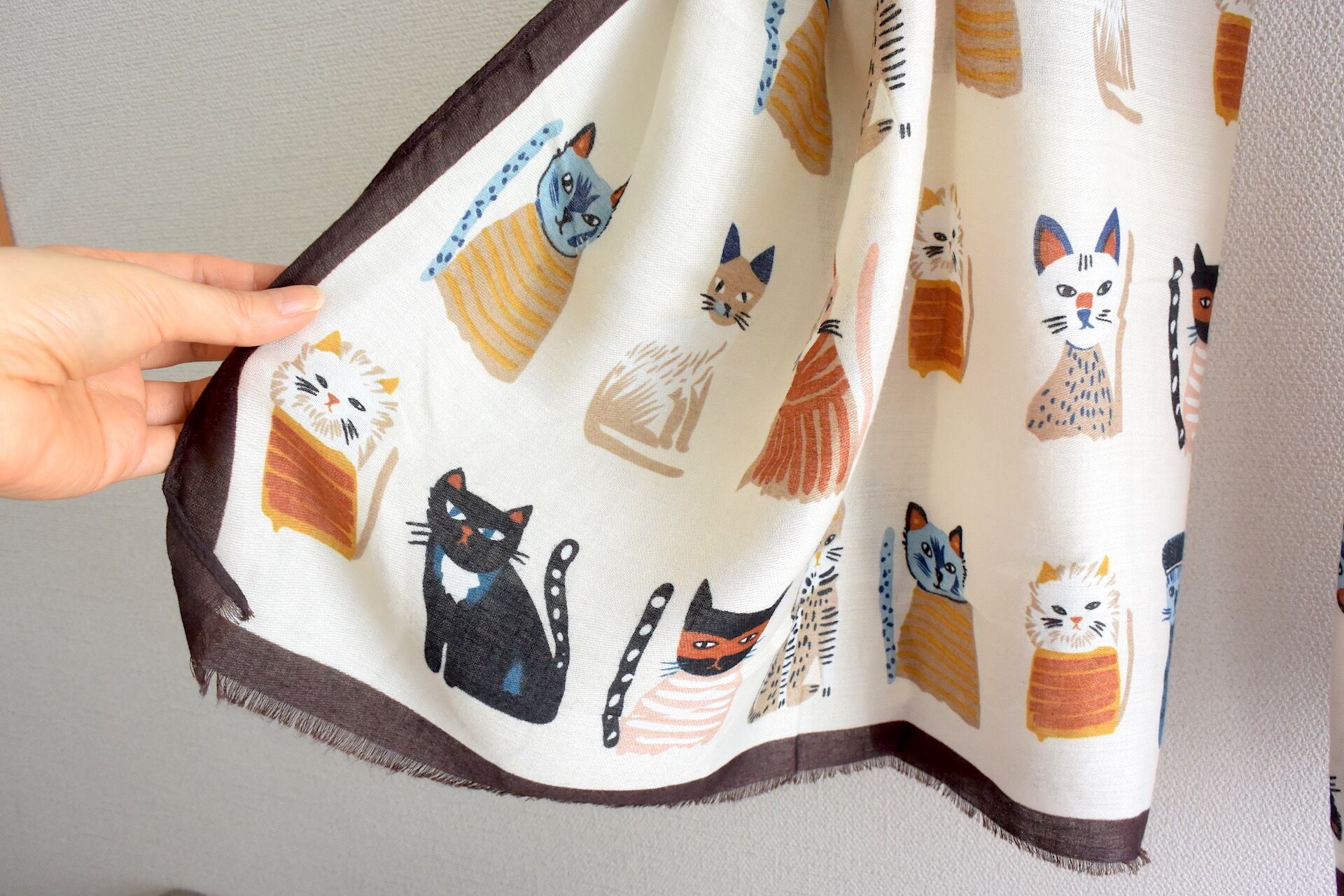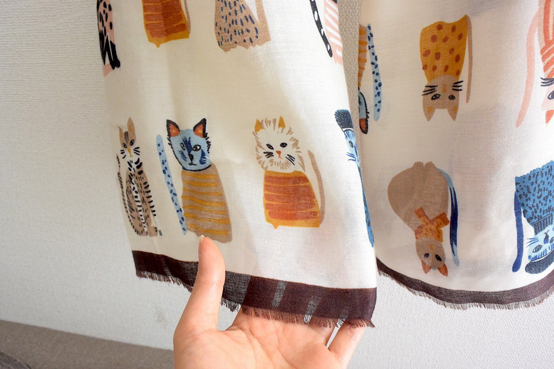 個性的な猫いっぱいのコットンレーヨンの大判ガーゼストール ベージュ
